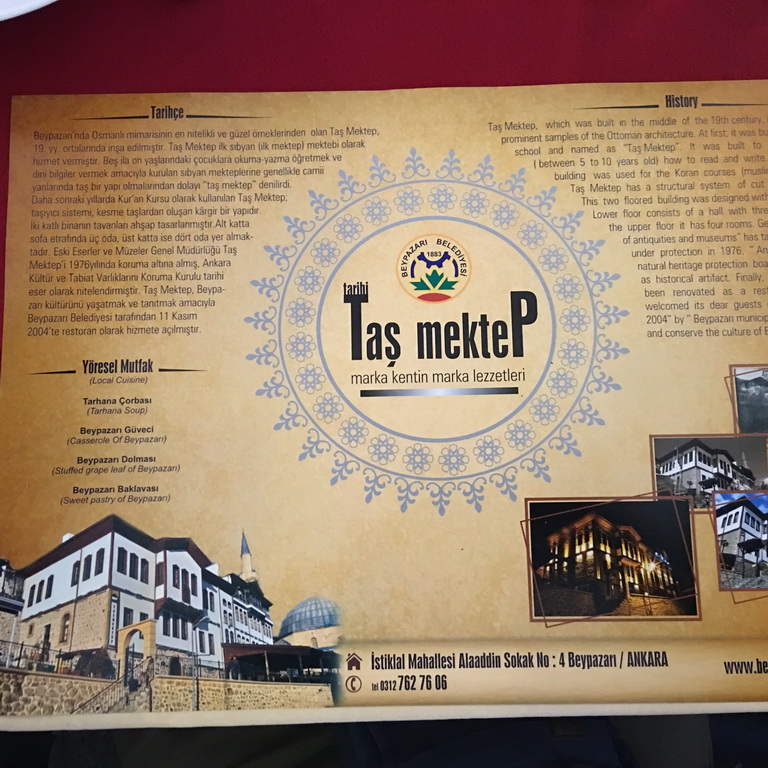Birde tabela ismi uzunca olan ablalarla teyzelerin servis yapıp satış yaptıkları 80 GATLI YEMESİPEK DATLI EV BAKLAVASI BEBEĞİMİN YERİ nde bolca alışveriş yaptık. Datlı dilli hoş sohbetli ablalar baklava ve dolmalarla ikramz üerine ikramda bulundular sağ olsunlar.Sonrasında da Beypazarı Belediyesine ait TAŞ MEKTEP güzel otantik restoranda öğlen yemeklerimizi yedik.Menümüz yöresel ev tarhanası,yine yöresel ismiyle göveç,80 gatlı baklava ve çay.