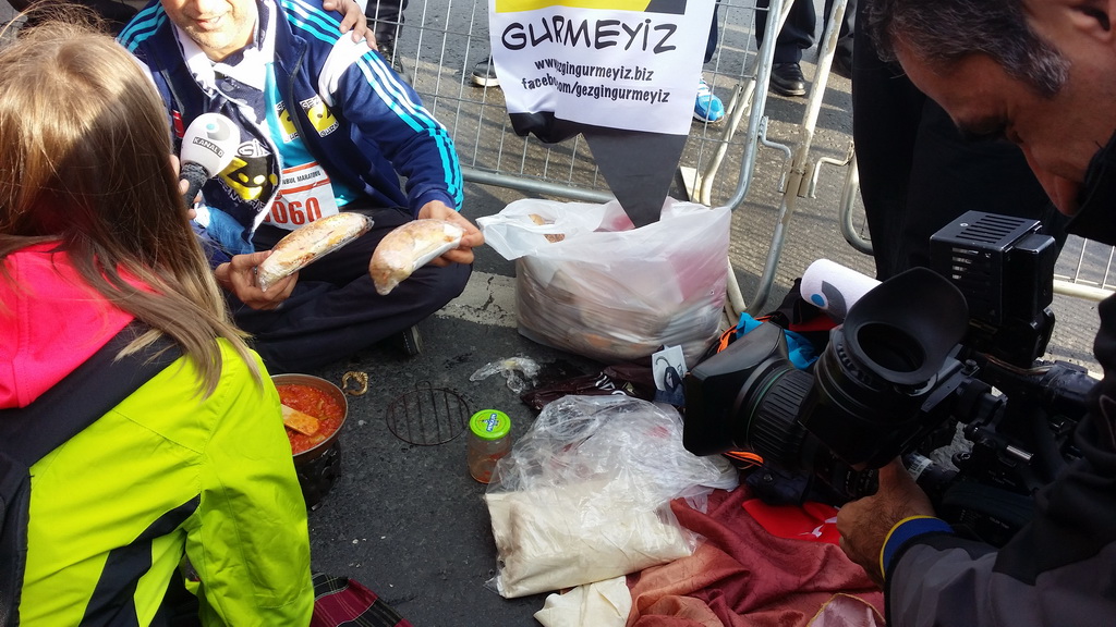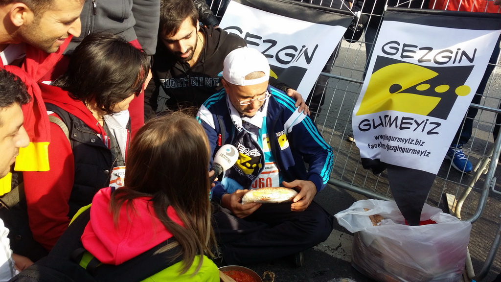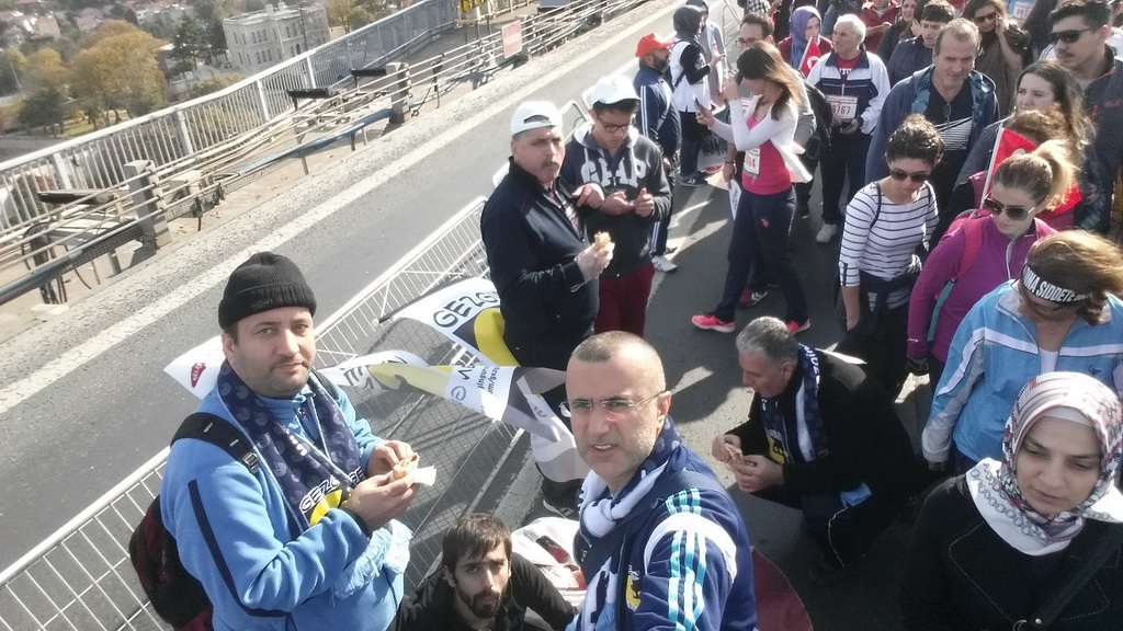 Aaaa bakın menemen yapıyorlar.Ayy çok ilginç,iyi fikir,süpermiş gibi yorumları duymaya başladık.Deliiiileeeer diyip gülen geçenler de olmuş,bak ben bu kısmını duymadım.O anda aynı hizada karşımızda talihsiz bir kaza oldu,üzüldük.Bir bayanın ayakları köprü bağlantısındaki mazgallara sıkışınca canlar sıkıldı.O sıralarda soframıza Kanal D haber ekibi geldi.Mini minnacık bir röportajla hanım sunucuya lavaşla menemen ikramımızda oldu.Ayrıca soframızda Acıcık Çiğköftenin sahibi Adnan bey ve oğlu lavaşla çiğköfte ikramı yaptılar.Bizde ilaveten Uncular caddesindeki meşhur Üsküdar pilavcısının ikramı olan karışık sandviçleri soframızı ziyarete gelen arkadaşlara ikram ettik.Koşu da Fahrettin Çolak,Büfeci İbrahim ve Cem abi,Galip Sarıgöz abi ve arkadaşlarıyla,termoslarla çay keyfide cabası. Emeği geçen arkadaşlarıma, lezzetimizi tatmaya ortak olan sporseverlere,Üsküdar Pilavcısı Serkan Sağdıç kardeşime ve ekibimize zaman ayıran Kanal D haber ekibine teşekkürlerimle.